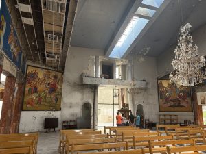 Con loro incontriamo anche la mamma del piccolo Wadie, 4 anni, che da quel 22 giugno è rimasto senza il papà. «Lo aspettavamo a casa alla fine della cerimonia per andare insieme a prendere un gelato e Wadie ogni tanto lo cerca ancora», dice la mamma. Mentre Anjie è stata freddata all’esterno della chiesa, il corpo del papà di Wadie non è mai stato ritrovato; perché, dopo aver colpito le persone all’ingresso con una scarica di mitra, l’attentatore è corso in chiesa è si è fatto saltare in aria. Secondo i racconti, nel momento in cui ha varcato la soglia, un gruppo di persone – intuite le sue intenzioni – lo ha trascinato verso l’esterno buttandolo a terra e facendo da scudo col proprio corpo ad altre decine di fedeli che sono sopravvissuti. Il padre di Wadie era uno di loro. «Se la bomba fosse esplosa nel centro della chiesa, verso l’alto», ci raccontano, «parte dell’edificio sarebbe crollato, in questo modo invece è esplosa all’entrata, verso il basso, creando una voragine di alcuni metri, ma in molti si sono salvati». I danni sono comunque ingenti e il soffitto è in gran parte crollato.