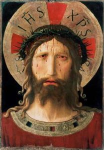 La scena dell’incoronazione di spine, Il Cristo deriso nel litostroto è di particolare impatto: attorno alla figura di Gesù bendato ci sono mani che schiaffeggiano, un volto beffardo che sputa, una mano che rompe una canna colpendo la testa. Eppure l’atteggiamento del Cristo è regale, seduto su una pietra che non è un trono ma che lo diventa per l’atteggiamento del Signore. Ricorre spesso questa rappresentazione di Cristo Re, come nel famoso ritratto che si può contemplare nella mostra a Palazzo Strozzi del Cristo coronato di spine con gli occhi rossi, un ritratto in cui specchiarsi e piangere nella preghiera, tanta è l’intensità del dipinto. Timothy Verdon afferma che il Beato Angelico è il maggior interprete della vita di preghiera cristiana, conoscendo dal di dentro, con la sua vita interiore, spirituale, i misteri delle fede che era chiamato a dipingere. E Giorgio Vasari nella sua Vita dell’artista scrive che «non avrebbe messo mano ai pennelli se prima non avesse fatto orazione» e «non fece mai crocifisso che non si bagnasse le gote di lagrime». E mette in bocca a fra Giovanni che «chi faceva quest’arte, aveva bisogno di quiete e di vivere senza pensieri; e che chi fa cose di Cristo con Cristo deve stare sempre».