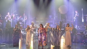 Un concerto che diviene uno spettacolo immersivo, anche grazie alla proiezione, sullo sfondo, di sequenze tratte dai film evocati dalle colonne sonore e alla trama di luci, che accendono il palco di colori che richiamano la fotografia delle pellicole citate, fino a trasformare un tamburo in una luminosa luna piena durante l’esecuzione di Interstellar.