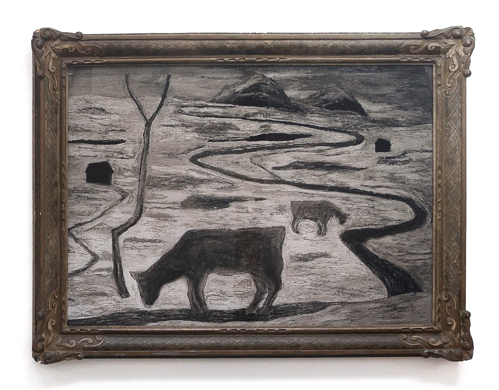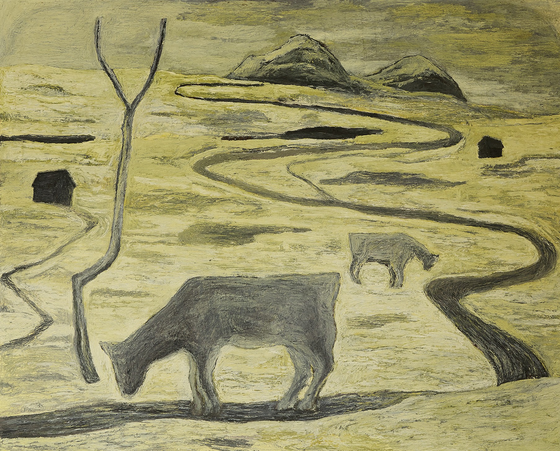 Ci sono animali, case, strade sinuose nel suo paesaggio. C’è un rifuggire da sistemi consolidati, l’esigenza di “scarnificare” le forme per giungere a una purezza intima. La dislocazione figurale non è mai prevedibile. In questo modo il paesaggio diventa il tassello di una storia costruita su un iter provvisorio, senza retorica, senza indulgenza. Le forme, schematiche ed essenziali, non descrivono, quanto piuttosto alludono a un universo fluttuante. Più lo sguardo vi si avvicina, più viene sedotto dalla sua profondità. Emanano un silenzio catartico, un traboccamento di desiderio.