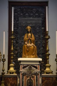 Nella cappella dei Santi Martiri è venerata la statua lignea della Madonna di Otranto (XIV secolo), anch’essa legata ai fatti del 1480. Eccone la storia. Dopo la presa di Otranto uno dei turchi che saccheggiano la Cattedrale si impossessa della Madonna e pensando fosse d’oro e la porta a Valona. Quando si accorge che si tratta di una statua lignea, quindi per lui senza alcun valore, vuole sbarazzarsene e la rinchiude in un ripostiglio. Nella casa del turco c’è una schiava cristiana, originaria di Otranto, che conosce la provenienza della statua. Vorrebbe restituirla alla dignità liberandola dal ripostiglio, ma non sa come fare. La moglie del turco stava per partorire e soffriva di fortissimi dolori, mentre i medici non sapevano come reagire. Forse è proprio la Madonna a suggerirle la soluzione. La schiava si presenta al turco, promettendo che la Signora sarebbe intervenuta per salvare la moglie se il turco avesse liberato la statua. Il turco pensa che la schiava stia cercando il modo di ritornare in patria. Le dice quindi che è pur sempre una schiava, destinata a rimanere a Valona, e anche se le darà la Madonna non potrà riportarla a Otranto. La risposta della schiava è spiazzante: la Signora stessa troverà il modo per tornare a Otranto. Il turco promette che, se la moglie fosse guarita, avrebbe liberato la statua. Subito dopo la promessa i dolori della moglie cessano, e la donna porta felicemente a termine il parto. Il turco, pur meravigliato dal prodigio, non si converte, ma mantiene la promessa. Fa mettere la statua su una barca senza remi, per vedere se davvero la Madonna, come aveva detto la sua schiava, troverà il modo per tornare a Otranto. Poco dopo la barca, spinta da una mano invisibile, si stacca dalla riva e prende il mare, giungendo a Otranto pochi giorni dopo, accolta dalla popolazione festante. La venerazione per la Madonna di Otranto è molto forte. Nel 1564 papa Pio IV, su richiesta di mons. Antonio De Capua, arcivescovo di Otranto, concede perpetuo giubileo a chi avesse visitato la Cattedrale dal pomeriggio del 7 al tramonto dell’8 settembre, Festa della Natività di Maria, accostandosi alla Penitenza e all’Eucaristia, pregando per le intenzioni del Pontefice. In seguito, Leone XII estese il giubileo dal pomeriggio del 7 al tramonto del 16 settembre. La Madonna di Otranto oggi attende i pellegrini sull’Altare dei Martiri, circondata dai sette armadi che custodiscono le loro reliquie, e sono sempre moltissimi quelli che si affidano alla sua materna protezione.