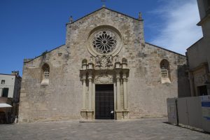 Alla Cattedrale si giunge oltrepassando le potenti mura e percorrendo le stradine della città vecchia, entrando dal castello costruito nel 1578 o salendo dalla porta Alfonsina, sul lato del porto, dopo averne superata un’altra di epoca più recente. La cattedrale romanica, costruita intorno al 1080, è dedicata alla Vergine Assunta. Sulla facciata spiccano un portale barocco del 1674 con lo stemma dell’arcivescovo che lo aveva commissionato e un rosone a 16 raggi. L’interno è ampio e si sviluppa su tre grandi navate divise da 14 colonne. Il pavimento della Cattedrale è decorato da un mosaico di ispirazione bizantina lungo 52 metri e costituito da oltre 600.000 tessere, realizzato tra il 1163 e il 1165. Intorno all’Albero della Vita figure allegoriche rappresentano la condizione umana e il suo destino eterno, la lotta tra il bene e il male, le virtù e i vizi, la salvezza e il peccato, con scene tratte dall’Antico e dal Nuovo Testamento, dai vangeli apocrifi, dai cicli cavallereschi, dai bestiari medievali. Si tratta di uno dei più estesi e meglio conservati mosaici medievali in Europa.
