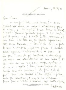 Purtroppo, non fu così. Questa e l’ultima lettera conservata nell’archivio Ares. Raboni sarebbe morto l’anno successivo.